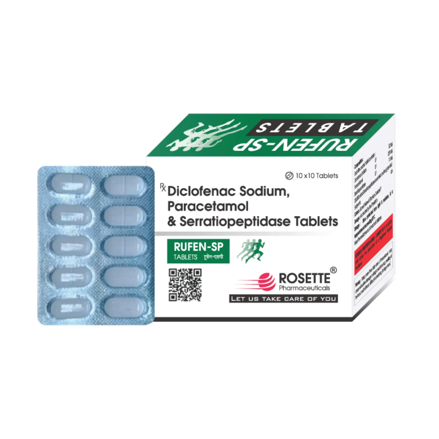 Rufen-SP is a Diclofenac 50mg + Paracetamol 325mg + Serratiopeptidase 15mg tablet formulated for the short-term management of pain, inflammation, and swelling. Diclofenac helps reduce inflammation and pain, Paracetamol provides additional analgesic support, and Serratiopeptidase, an enzyme, helps in reducing swelling and improving tissue recovery.