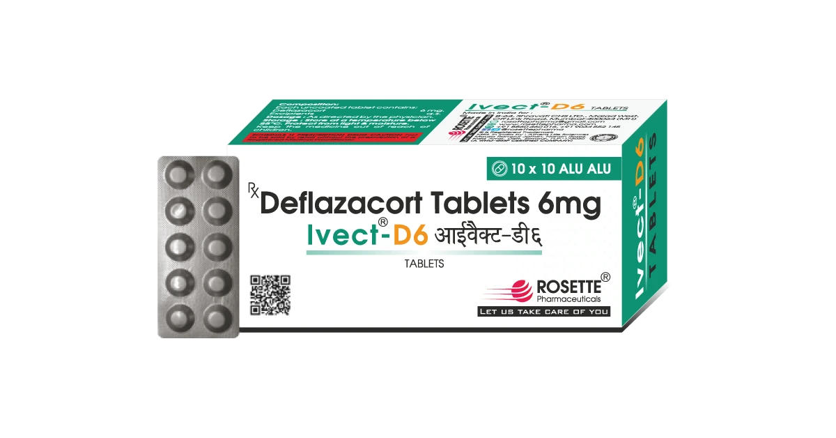 Ivect D6 Tablet contains Deflazacort 6mg, a glucocorticoid (corticosteroid) medicine used to help manage inflammation, autoimmune conditions, and allergic reactions. It works by reducing swelling, pain, and immune system overactivity, making it an effective treatment for rheumatoid arthritis, asthma, severe allergies, skin disorders, and muscular conditions such as Duchenne muscular dystrophy (DMD).