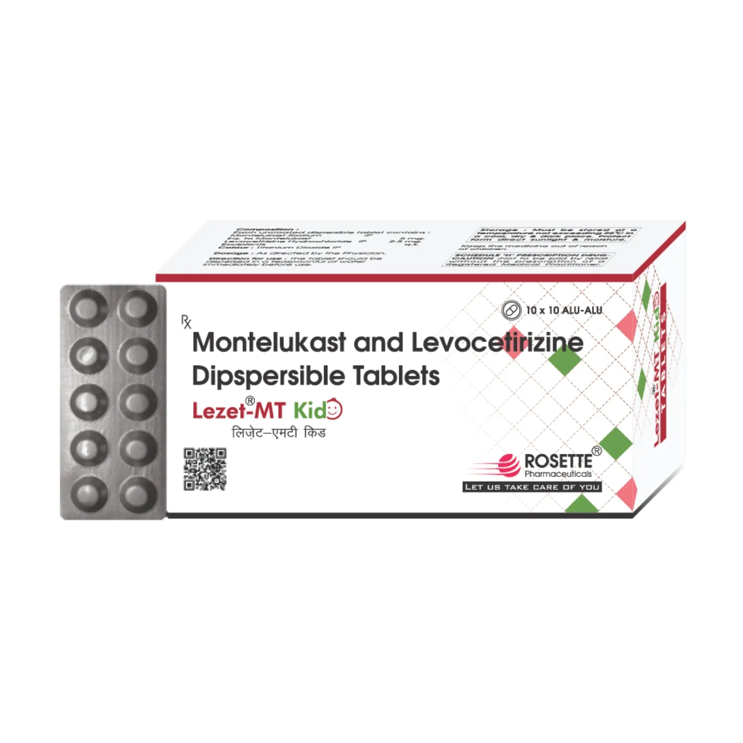 Lezet MT Kid is a Levocetirizine 2.5mg + Montelukast 5mg tablet specially formulated for the management of allergic conditions in children. It combines Levocetirizine, an antihistamine that helps reduce symptoms like sneezing, runny nose, and itching, with Montelukast, which works by controlling inflammation and airway sensitivity.