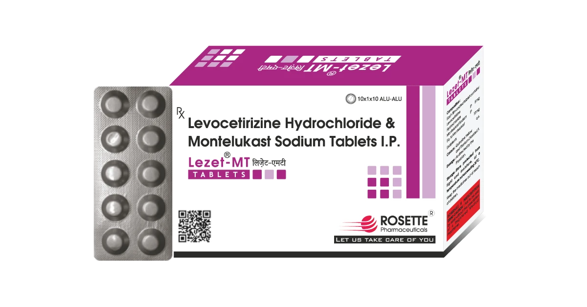 Lezet MT Tablet is a combination medicine that helps manage allergies and respiratory conditions. It supports in relieving symptoms like sneezing, runny nose, nasal congestion, and breathing difficulties caused by allergic reactions. It is commonly recommended for people with seasonal allergies, hay fever, and mild asthma symptoms.