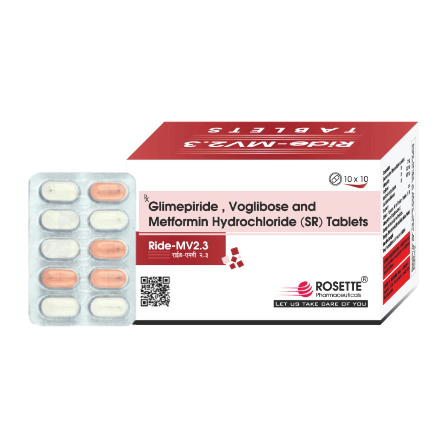 Ride M2.3 is a Metformin 500mg + Glimepiride 2mg + Voglibose 0.3mg tablet formulated for the management of Type 2 diabetes. It combines three complementary actions—Metformin helps reduce glucose production and improves insulin sensitivity, Glimepiride stimulates insulin release from the pancreas, and Voglibose delays carbohydrate absorption in the intestine to control post-meal blood sugar spikes.