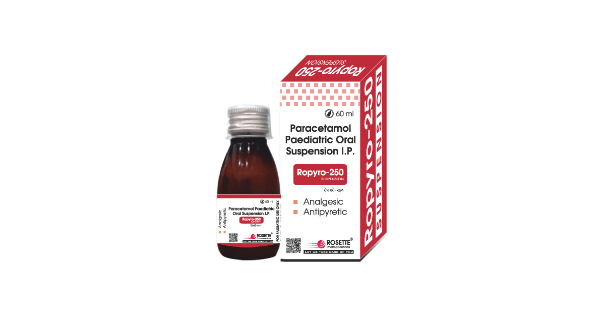 Ropyro 250 Suspension contains Paracetamol 250mg, a well-known analgesic and antipyretic formulation designed to support comfort and well-being in children and adults. It is available in an easy-to-administer liquid suspension, making it suitable for pediatric and general use under medical guidance.