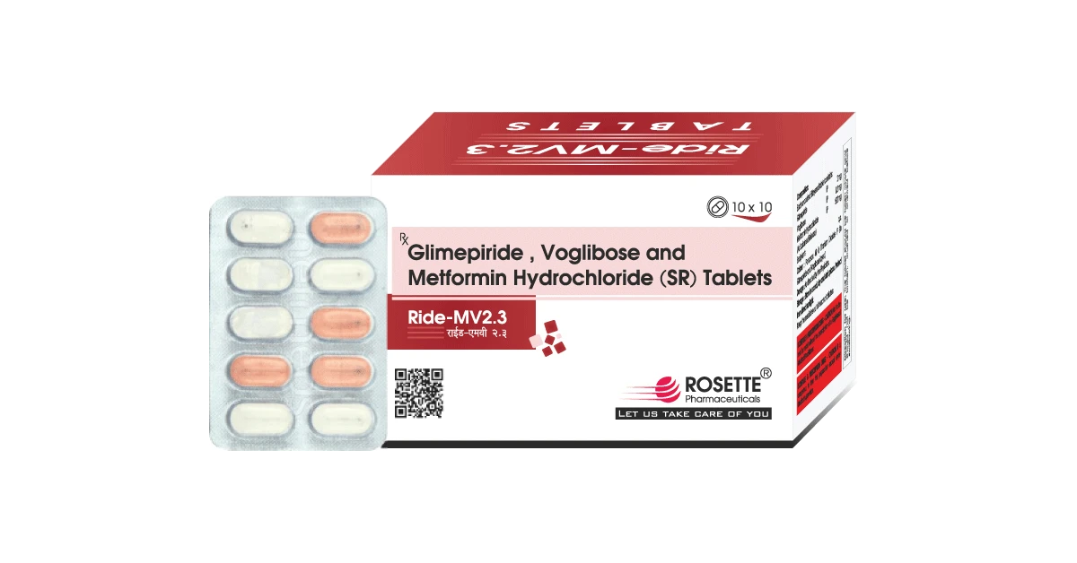 Ride MV 2.3 Tablet is a combination anti-diabetic medication containing Metformin 500mg, Glimepiride 2mg, and Voglibose 0.3mg, designed to provide effective blood sugar control in type 2 diabetes. This triple-action formula helps reduce glucose production, enhance insulin release, and slow carbohydrate absorption, ensuring better glycemic control throughout the day.