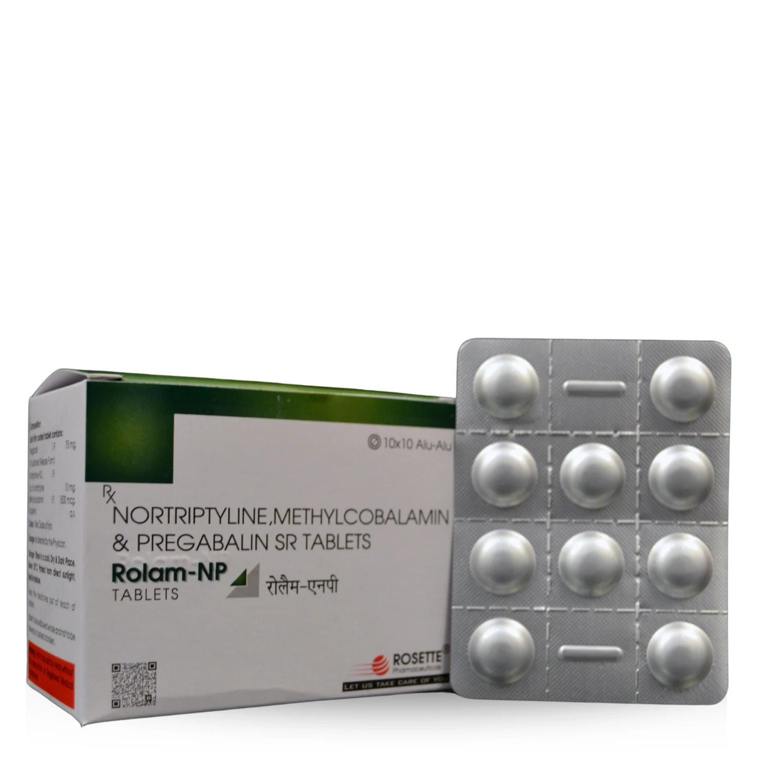 One of the key advantages of Rolam NP Tablet is its combination of Pregabalin, Methylcobalamin, and Nortriptyline, which ensures comprehensive nerve protection and pain control. Pregabalin helps reduce nerve pain, while Methylcobalamin repairs nerve damage, and Nortriptyline enhances nerve function, making it an ideal choice for chronic nerve disorders.