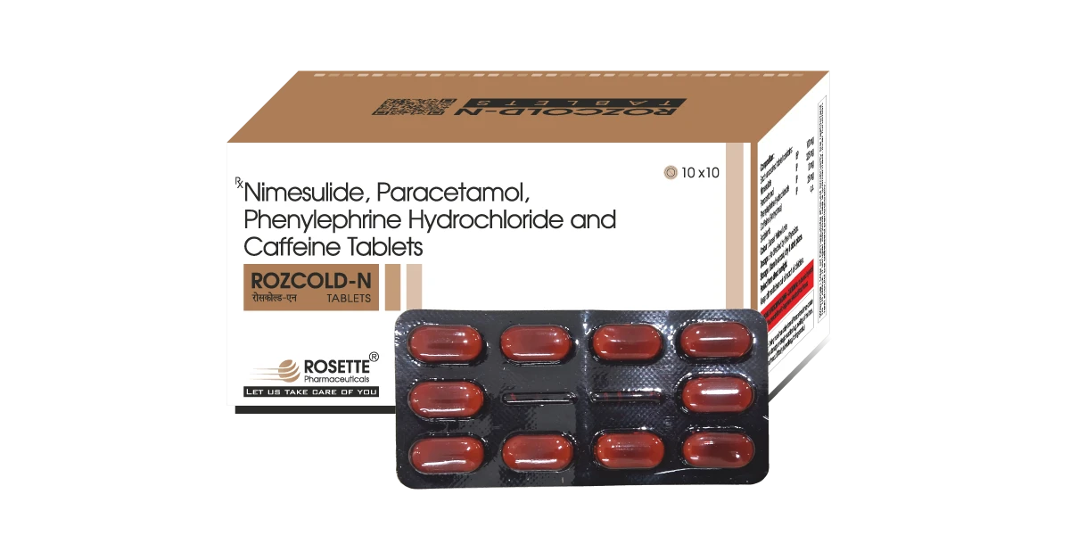 Rozcold N is a combination tablet containing Nimesulide 100mg, Paracetamol 325mg, Phenylephrine 10mg, and Caffeine 25mg, designed for balanced relief under medical supervision. The tablet form ensures precise dosage and convenient use.