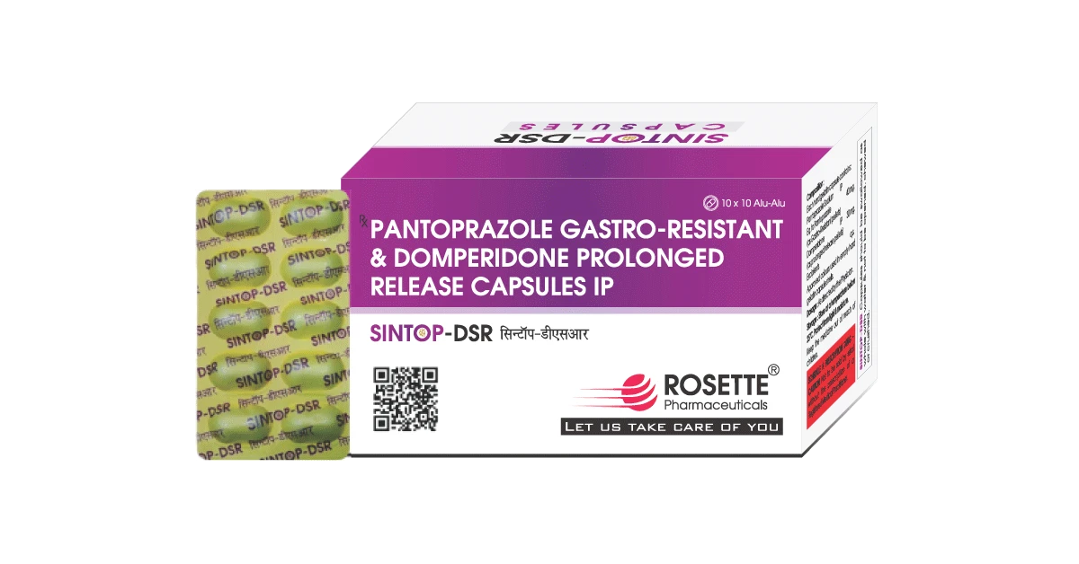 Sintop DSR Capsule is a clinically trusted acid-regulating formulation that provides dual-action support for acidity and digestion. It is widely recommended for individuals with acid reflux, heartburn, bloating, and nausea, ensuring better stomach comfort and digestive function.